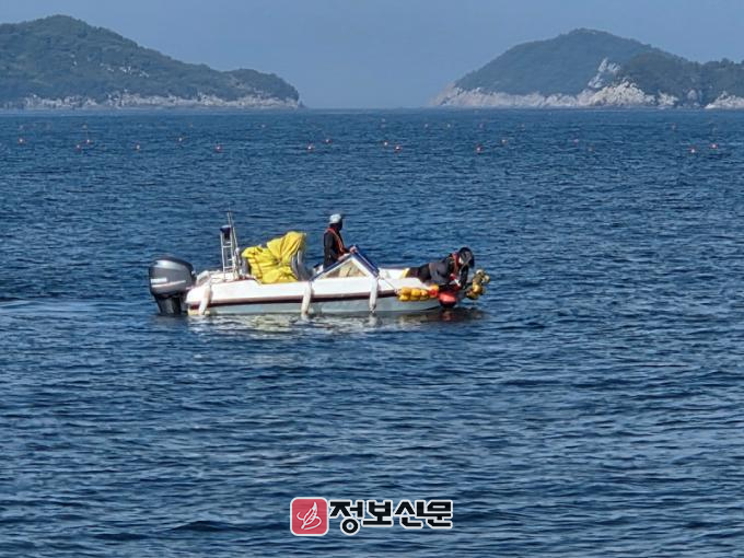 ![]() ▲ 여수·고흥·완도 경계 해역의 불법 양식시설물(부표)을 철거하고 있다. |