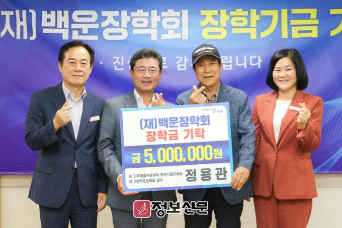 정용관 감사는 “백운장학회 감사로 선임된 이후 장학사업에 더 깊이 참여하고 싶다는 마음이 있었는데 이번 기회로 그 뜻을 이루게 되어 기쁘다”며 “저의 후원이 학생들에게는 든든한 응원이 되고, 시민들에게는 나눔에 동참할 용기를 드리는 계기가 되기를 바란다”고 말했다.