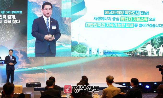 김영록 전남도지사는 이날 서울 롯데호텔 크리스탈볼룸에서 ‘대한민국 경제, 지방에서 길을 찾다’라는 주제로 열린 경제포럼에 참석해, 재생에너지 발전수익을 에너지 기본소득 기금으로 조성해 주민에게 고르게 환원하는 ‘에너지 기본소득 제도’를 본격 추진하겠다고 밝혔다.