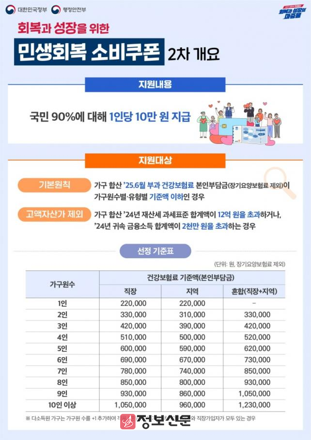 2차 소비쿠폰 소득 하위 90% 선정은 2025년 6월 부과된 건강보험료 본인 부담금 가구별 합산액을 기준으로 한다. 이 합산액이 가구원 수별 선정기준 이하(붙임1 참조)인 경우 지급대상자가 된다.