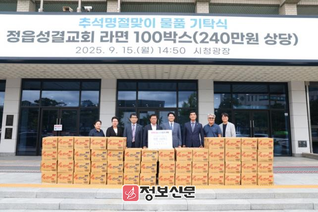 정읍성결교회(담임목사 박병대)는 같은 날 라면 100박스(240만원 상당)를 기탁했다. 교회는 ‘선한 영향력을 나타내는 교회와 성도’라는 비전을 바탕으로 2020년부터 매년 명절에 라면을 꾸준히 기탁해왔다.