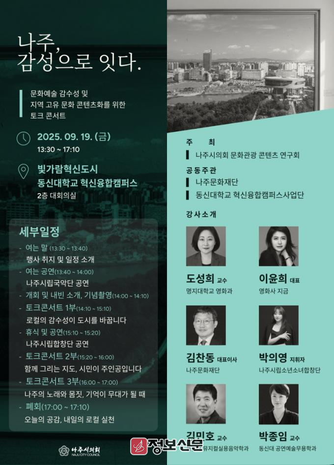 한편, ‘나주시 문화․관광 콘텐츠 연구회’에는 주최하는 토크콘서트는 당초 7월 19일 예정되었으나, 집중호우로 인한 지역 피해와 안전 우려로 한 차례 연기된 바 있다.