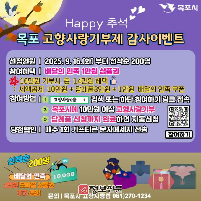 ![]() 목포시, 추석 맞이 고향사랑기부 감사 이벤트 추진 |