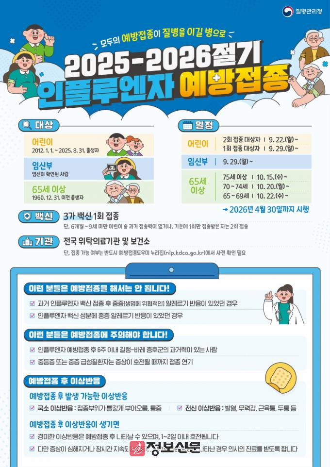 무료 접종 대상은 6개월~13세 어린이, 임신부, 65세 이상 어르신이다. 특정일에 집중되는 혼잡을 예방하기 위해 연령대별 순차적으로 진행된다. 65세 이상은 10월 15일부터 시작되는 코로나19 예방접종과 동시에 접종받을 것을 권고했다.