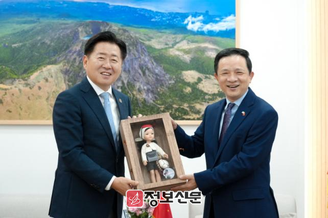 오영훈 지사는 15일 도청 집무실에서 다이빙 대사와 면담을 갖고, 취항을 앞둔 제주–칭다오 물류항 정기 항로와 한중 지방정부 간 ‘환해연안협의체’ 구상 등 실질적 협력 방안을 논의했다.