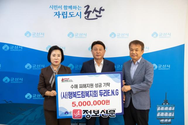 ![]() (사)행복드림복지회 두리 E.N.G, 군산시 수해 피해지원을 위한 성금 500만 원 쾌척 |