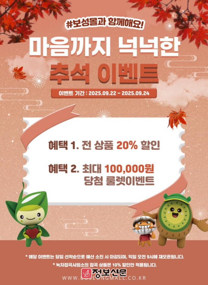 이번 행사에서는 보성몰 이용 고객 전원을 대상으로 최대 20% 할인(일부 품목 제외)이 적용되며, 최소 2천 원부터 최대 10만 원까지 적립금을 받을 수 있는 룰렛 이벤트도 마련됐다.