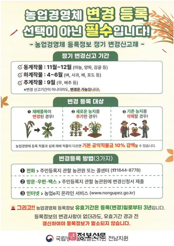 ![]() 국립농산물품질관리원전남지원영광사무소, 농업경영체 등록 변경신고제 운영 |