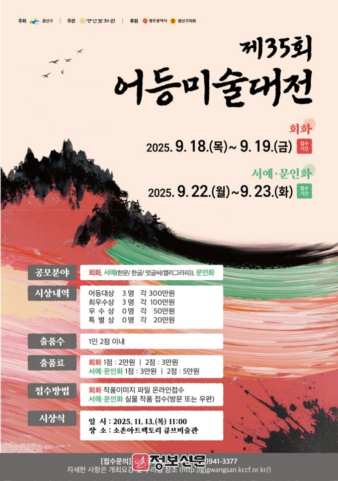 회화는 19일까지 전자우편(gsc3377@hanmail.net)으로 접수하고, 서예·문인화는 22일부터 23일까지 광산문화원(광산구 상무대로 265, 2층)에서 방문 또는 우편접수하면 된다. 수상작은 10월 중 선정하며, 부문별 대상 수상자에게는 각 상금 300만 원을 수여한다.