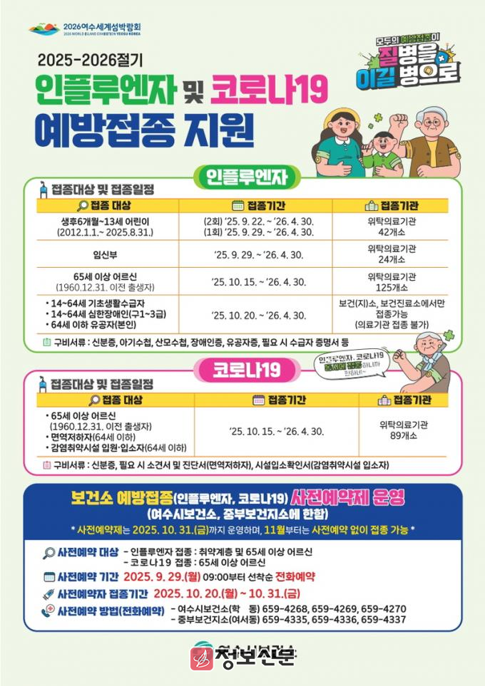 여수시보건소와 중부보건지소는 10월 한 달간 65세 이상 어르신과 취약계층을 대상으로 사전예약제를 운영한다. 예약은 9월 29일 오전 9시부터 선착순 전화로 가능하며 예약자 접종 기간은 10월 20일부터 31일까지다.