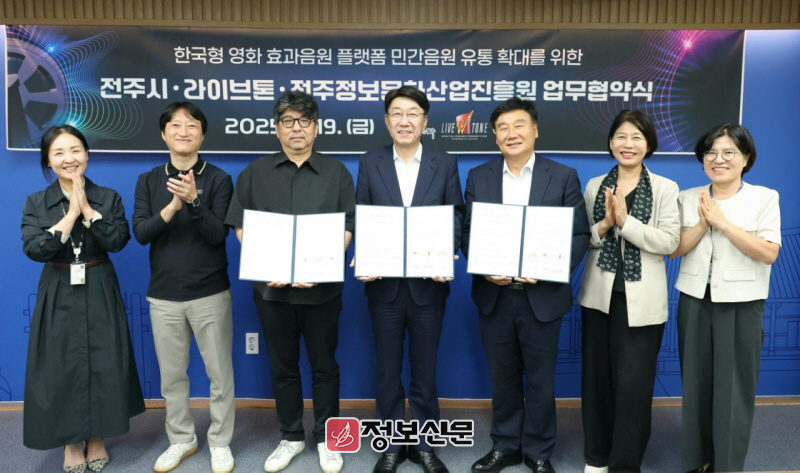 전주시와 (재)전주정보문화산업진흥원(원장 허전, 이하 진흥원), 국내 최대 영화음향 전문기업인 라이브톤(대표 최태영)은 19일 시청 3층 회의실에서 우범기 전주시장과 허전 진흥원장, 최태영 대표 등이 참석한 가운데 ‘한국형 영화 효과음원 플랫폼(케이사운드 라이브러리) 서비스 확산을 위한 업무협약’을 체결했다.