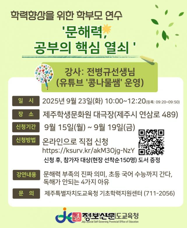 ![]() 제주특별자치도교육청, 초등 보호자 대상 전병규 교사 초청 문해력 연수 운영 |