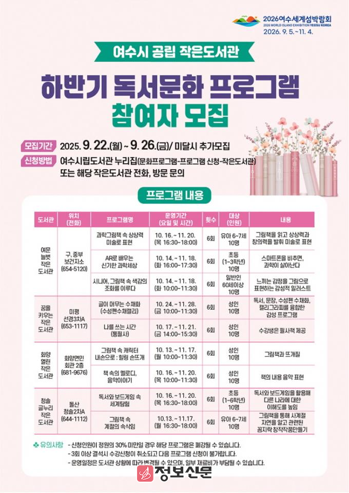 ![]() 여수시, 공립 작은도서관 ‘하반기 독서문화 프로그램’ 수강생 모집 |