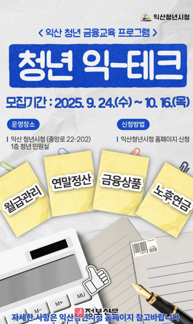 익산시는 오는 10월 21일부터 12월 16일까지 청년 맞춤형 금융교육 '청년 익테크'를 진행한다고 23일 밝혔다.