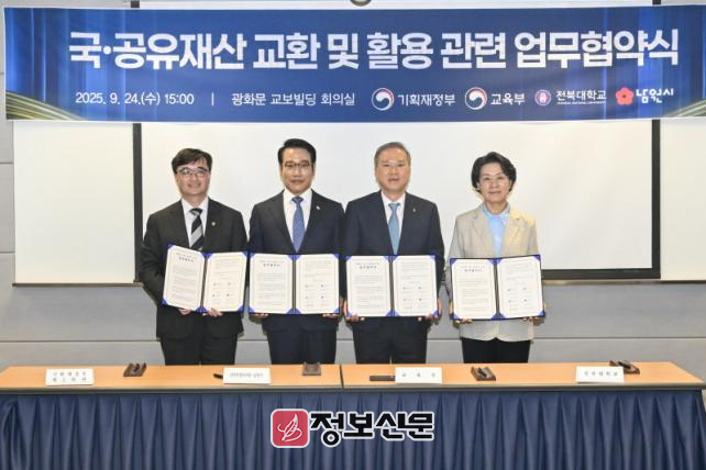 남원시는 오는 9월 24일(수) 오후 3시, 서울 광화문 교보빌딩 20층 회의실에서 열린 「2025년 중앙·지방간 국유재산 정책협의회」에서 기획재정부(제2차관 임기근)·교육부(차관 최은옥)·전북대(총장 양오봉)와 함께 부지교환 업무협약(MOU)을 체결했다고 밝혔다.