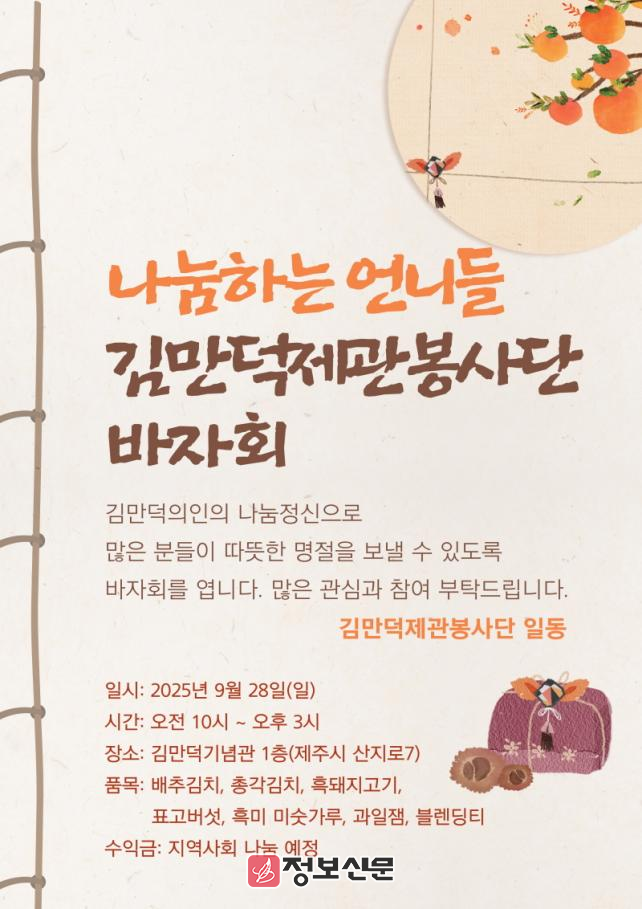 김순희 회장은 “김만덕제관봉사단은 앞으로도 다양한 활동을 통해 나눔의 가치를 실천해 나갈 것”이라며, “이번 바자회 역시 그 연장선에서 도내 어려운 이웃들과 따뜻한 정을 나누는 자리가 되길 바란다”고 전했다.