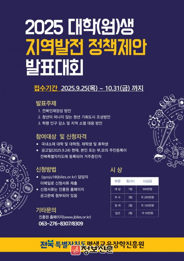 ![]() 전북특별자치도평생교육장학진흥원, 2025년 대학(원)생 지역발전 정책제안 발표대회 개최 |