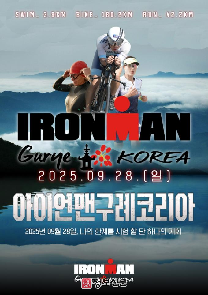 2025 아이언맨 구례 코리아는 수영(3.8km), 사이클(180km), 마라톤(42.2km) 3개 종목을 차례로 총 226km를 모두 17시간 이내에 완주해야 하는 국내 유일 풀코스 대회다. 완주자 중 상위자에게는 2026 아이언맨 월드 챔피언십 출전권이 부여된다.