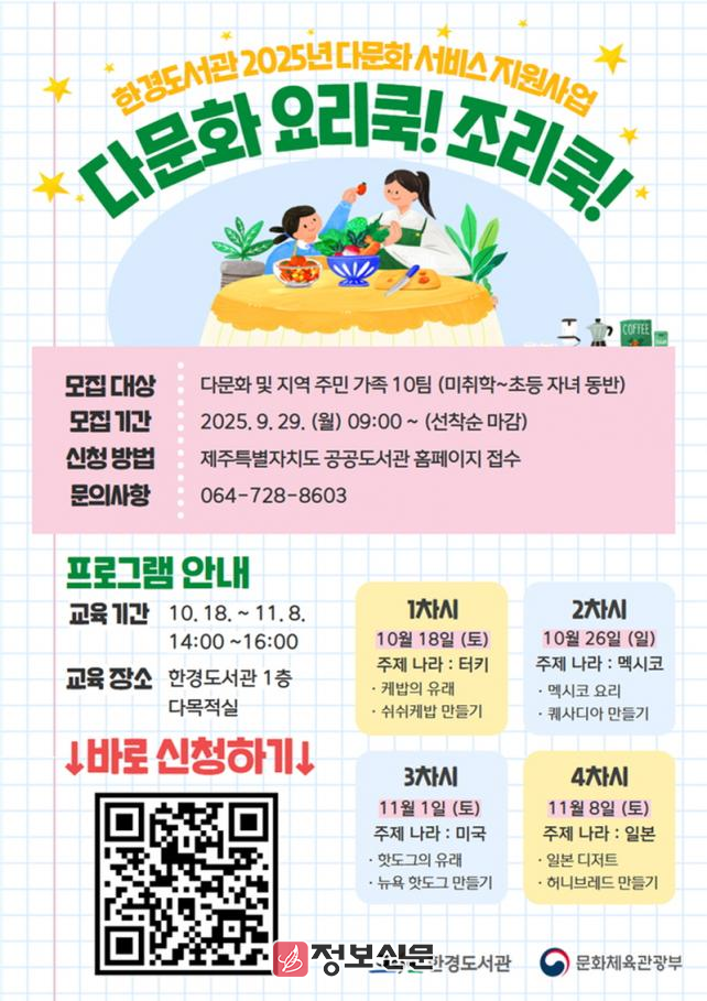 김봉석 탐라도서관장은 “이번 프로그램은 음식을 매개로 다양한 국가의 문화를 체험하고 이해할 수 있도록 마련했다”며, “지역 주민들의 많은 관심과 적극적인 참여를 부탁드린다”고 전했다.