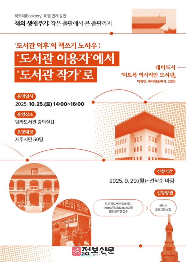 ![]() 탐라도서관, 10월 북토리 백창민 작가 초청 강연 개최 |