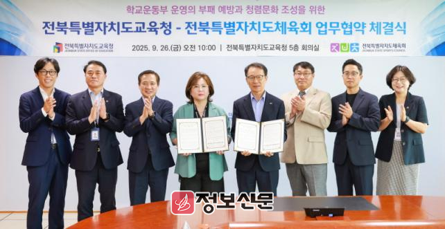 ![]() 전북특별자치도교육청, 전북자치도체육회와 청렴한 학교운동부 운영 위한 업무협약 체결 |
