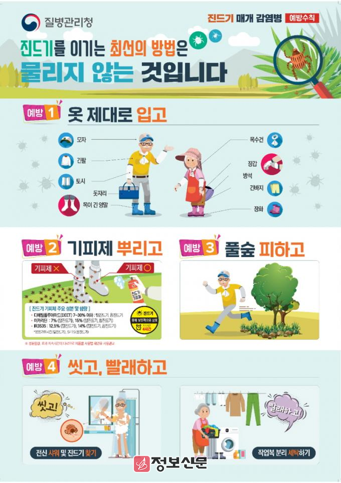 진드기 매개 감염병 예방의 핵심은 진드기에 물리지 않는 것이다. 이를 위해 ▲야외활동 전 모자·긴팔·긴바지·등산화·목수건·장갑·긴 양말 착용으로 피부 노출 최소화 ▲진드기 기피제 사용 ▲야외에서는 돗자리를 깔고 앉기 ▲활동 후 옷과 몸을 털고, 씻고, 세탁하기 등의 예방수칙을 준수해야 한다.