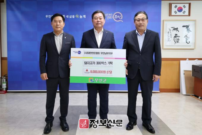 무안군청에서 열린 기탁식에는 ▲(사)대한한돈협회 무안남부지부(지부장 장근우) 돼지고기 300박스(800만 원 상당), ▲한국도로공사 함평지사(지사장 안제섭) 온누리상품권 500만 원, ▲한국전력 무안지사(지사장 구희준) 온누리상품권 200만 원이 각각 전달됐다.