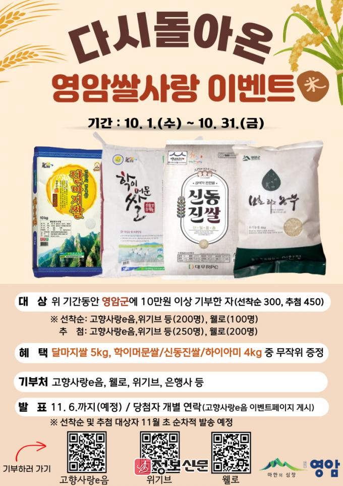 이영주 영암군 홍보전략실장은 “이번 이벤트를 통해 기부자분들께 영암 대표 쌀을 선물로 드리고, 동시에 지역 농가에도 활력을 불어 넣겠다”고 밝혔다.