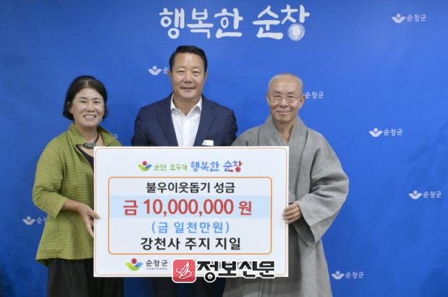최근 강천사 지일 스님은 순창군청을 찾아 저소득 아동과 문화소외 계층을 위해 써달라며 성금 1천만원을 최영일 군수에게 전달했다.