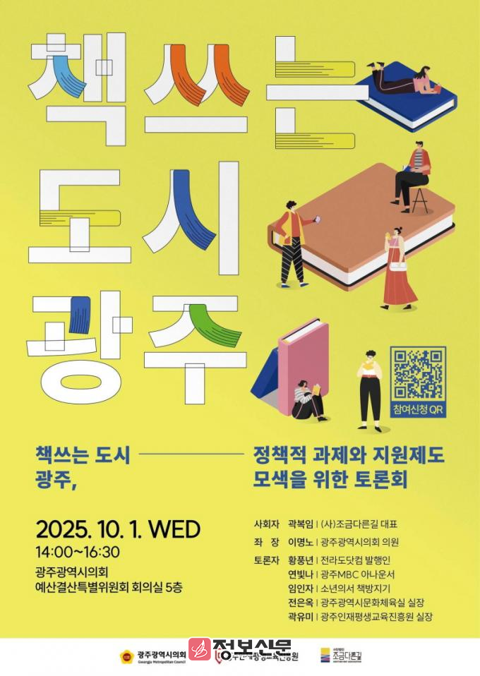 광주광역시의회 이명노 의원이 좌장을 맡으며, ▲황풍년(전라도닷컴 발행인) ▲연빛나(광주MBC 아나운서, 독서모임 ‘빛나는서재’ 운영자) ▲임인자(소년의서 책방 지기) ▲전은옥(광주광역시 문화체육실장) ▲곽유미(광주인재평생교육진흥원 인재개발실장) 등이 토론자로 나서 각자의 경험과 시각을 공유한다. 패널토론 이후에는 청중들과 플로어 토론을 이어갈 예정이다.