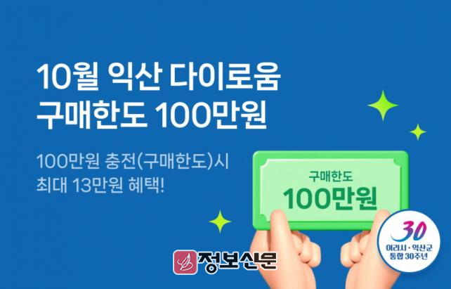 ![]() 익산시, 통합 30주년 맞이 익산 다이로움 개인별 구매한도 확대 |