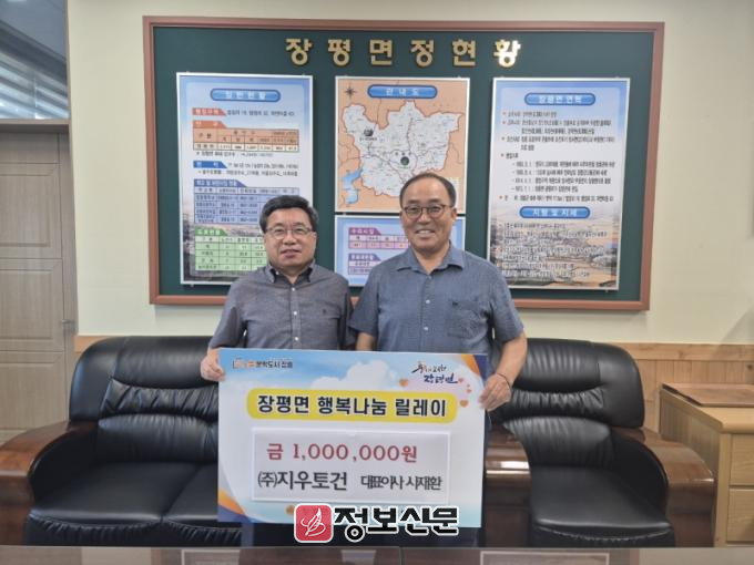 한성수 장평면장은 “소외된 이웃을 위해 나눔을 실천해 주신 지우토건에 깊이 감사드린다”며 “기탁해 주신 성금은 장평면지역사회보장협의체 특화사업 등을 통해 소외된 이웃들의 복지 향상을 위해 소중하게 사용하겠다”고 말했다.