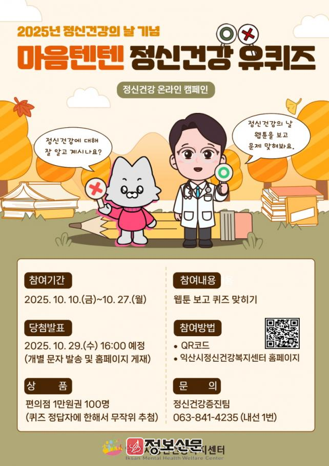 캠페인에 참여하려면 익산시정신건강복지센터 누리집(www.iksanmh.or.kr)에서 정신건강 관련 웹툰을 보고 문제를 풀면 된다. 정답자 중 100명을 추첨해 소정의 상품을 제공하며, 당첨자는 오는 29일 개별 안내된다.
