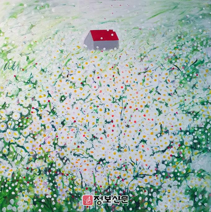 정 작가는 꽃과 집, 새와 바람 같은 자연의 모티브를 자유롭고 밝은 구도로 표현해 관람객들이 기억 속 아련한 ‘그곳’을 떠올리며 잠시 쉬어갈 수 있는 시간을 전한다. 섬세한 색채와 율동감 있는 화면은 일상에 지친 현대인에게 자연 속 휴식 같은 감성을 불러일으킨다.