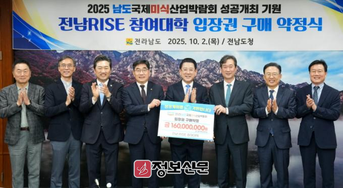 ![]() 김영록 전라남도지사가 2일 도청 접견실에서 전남RISE 참여 대학 총장단과 2025 남도국제미식산업박람회 입장권 구매 약정을 체결하고 있다. |