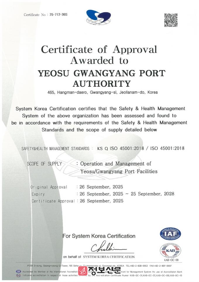 ![]() 여수광양항만공사, ISO45001(안전보건경영시스템) 최초 인증 획득 |