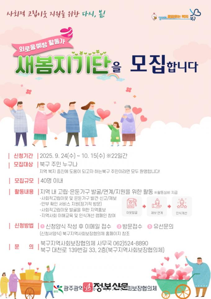 ![]() 광주시 북구, 사회적 고립 이웃 찾아 지원하는 ‘새봄지기단’ 모집 |