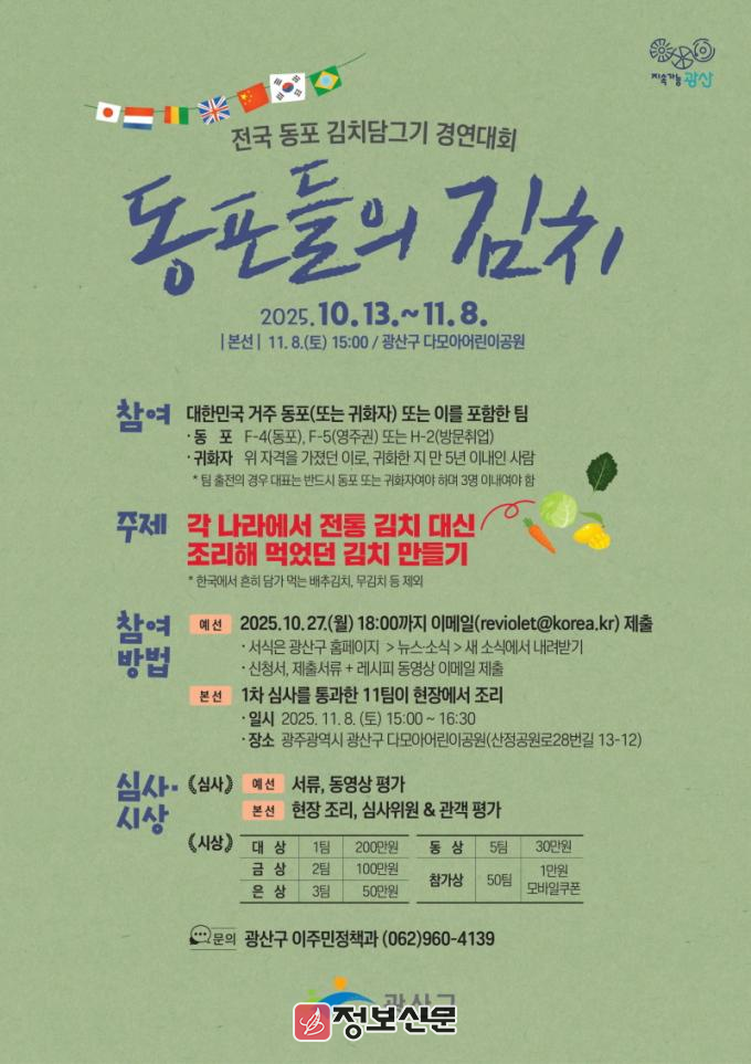 참가 대상은 국내 거주 동포(F-4, F-5, H-2 비자 소지자) 또는 귀화자(동포였던 자로 귀화한 지 만 5년 이내인 사람)이며, 개인 또는 팀 단위로 신청할 수 있다. 13일부터 27일까지 전자우편(reviolet@korea.kr)으로 신청서와 김치 조리 과정을 담은 5분 분량의 동영상을 제출하면 된다. 필요 서식은 광산구 누리집 새소식 란에서 확인할 수 있다.