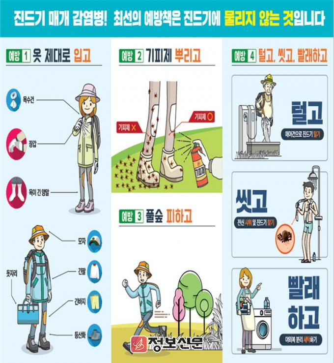강윤선 공공보건의료과장은 “진드기 매개 감염병 예방을 위해서는 개인별 예방수칙을 준수하고 야외활동 후 발열·구토·설사 증상이 나타나면 의료기관에 방문해 진료를 받을 것”을 당부했다.