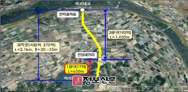 먼저 1공구인 백석저수지부터 전당네거리까지 0.65㎞ 구간은 지난 6월 착공한 상태로, 과학로 전체 구간에 편입되는 268필지(8만9709㎡) 중 국토교통부와 농림축산식품부 소유의 국유재산 78필지(7만4575㎡)에 대해 조달청과 지속적인 협의 결과 53필지(5만9368㎡)에 대한 무상귀속(새로 설치한 공공시설의 소유권이 법률에 따라 관리청에 무상으로 이전되는 제도) 행정 절차가 완료돼 편입부지 매입에 필요한 예산을 절감할 수 있게 됐다.