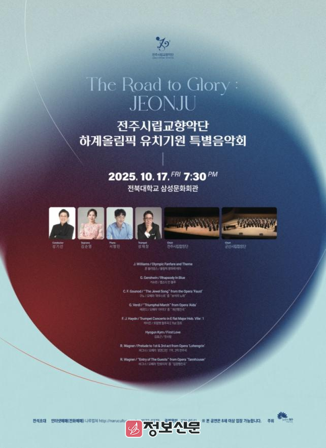 전주시립교향악단은 오는 17일 오후 7시 30분, 전북대학교 삼성문화회관에서 시민과 지역사회가 함께 올림픽 유치의 뜻을 나누는 특별음악회 ‘The Road to Glory: Jeonju’를 개최한다.