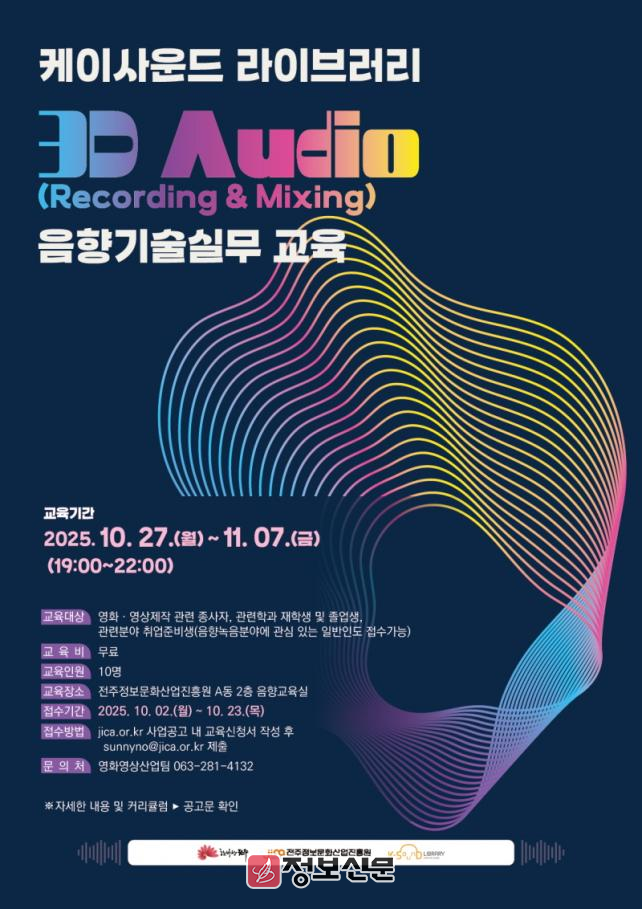 교육은 약 2주간 전주정보문화산업진흥원에서 진행되며, 영화·영상 제작 관계자와 음향 관련 재학생·졸업생, 관련 분야 취업준비생 등 누구나 신청할 수 있다. 교육 참여 희망자는 오는 23일까지 진흥원 누리집(www.jica.or.kr)에서 신청서를 작성해 제출하면 되며, 기타 자세한 사항은 전화(063-281-4132)로 문의하면 된다.