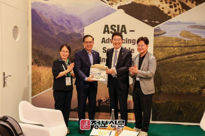 ![]() 지난 9일 아랍에미리트 아부다비에서 노관규 순천시장이 딘도 캄필란(Dindo Campilan) IUCN 아시아지역책임자와 양자회담을 갖고 기념사진을 촬영하고 있다(왼쪽부터 정선화 정부협력관, 딘도 캄필란 IUCN 아시아지역책임자, 노관규 순천시장, 황태주 전략기획국장) |