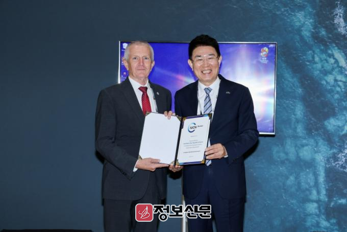 ![]() 지난 9일 아랍에미리트 아부다비에서 스튜어트 매기니스(Stewart Maginnis) IUCN 부사무총장이 노관규 순천시장에게 IUCN 가입증서를 전달하고 있다 |
