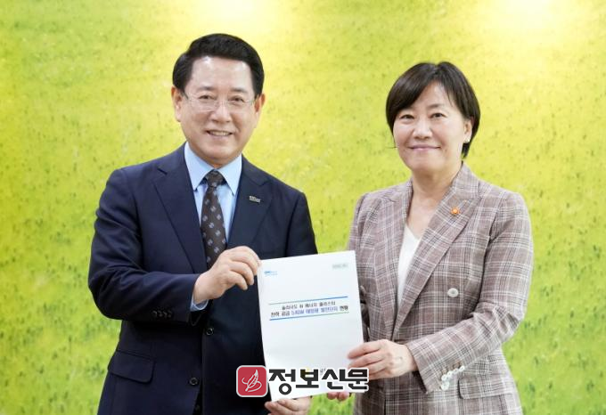 오후에는 송미령 장관을 만나 솔라시도 중심 ‘전남 에너지 미래도시’에 대규모 재생에너지 공급을 위해 국가 간척지 등에 대한 태양광 설치 활용 동의 등을 요청했다. 특히 지속되는 이상고온으로 전년 동기 대비 2.8배로 피해가 크게 늘어난 벼 깨씨무늬병의 농업재해 인정과 피해조사 후 복구비 지원, 깨씨무늬병 피해 벼 전량 매입을 강력 건의했다.