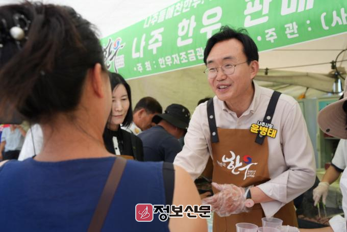![]() 윤병태 시장(오른쪽)이 농업인들과 함께 특산물 판촉 행사에 참여하고 있다.(사진 제공-나주시) |