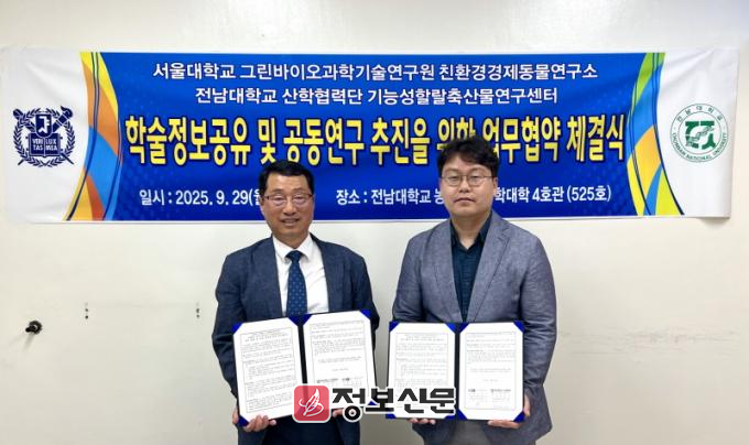 전남대 산학협력단 기능성할랄축산물연구센터(센터장 진구복)는 지난 9월 29일 서울대학교 그린바이오과학기술연구원 친환경경제동물연구소(소장 박병철)와 학술정보 공유 및 공동연구 추진을 위한 업무협약(MOU)을 체결했다.