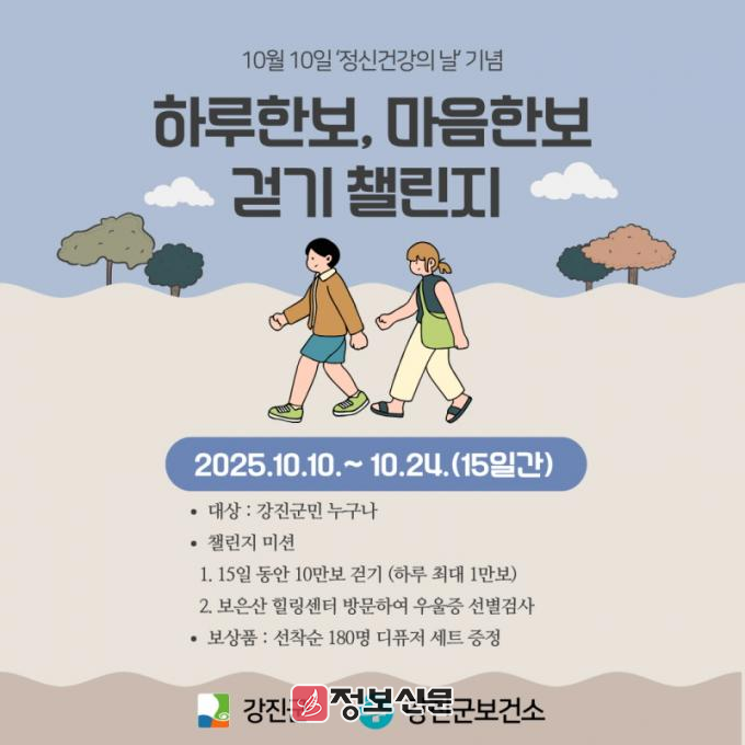 챌린지는 강진 군민 누구나 참여할 수 있으며, 15일간 10만보 걷기(하루 최대 1만보) 및 보은산 힐링센터(강진읍 고성길 162)에 방문해 우울증 선별검사를 실시하면 된다. 참여자 중 챌린지에 성공한 선착순 180명에게는 소정의 기념품을 제공할 예정이다.