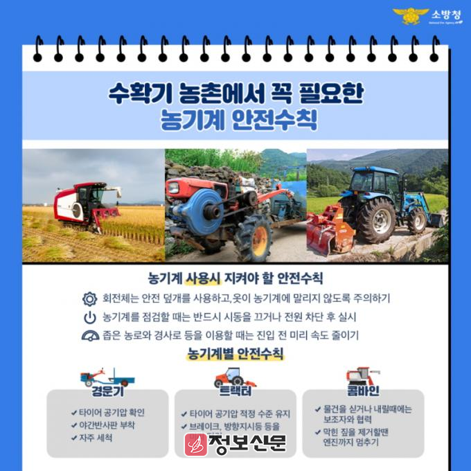순천소방서는 사고 예방을 위해 ▲농기계 사용 전·후 철저한 점검 ▲음주 후 운행 금지 ▲경사진 농로·출입로 이동 시 감속 및 주변 확인 ▲야간 주행 시 반사판 부착·방향지시등 활용 ▲도로 운행 시 도로교통법 준수 ▲농작물 과적 금지 ▲작업복은 소매나 옷자락이 조여진 형태 착용 등을 강조했다.
