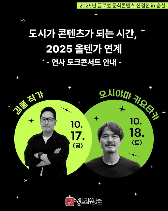 이번 토크콘서트는 「2025 글로벌 문화콘텐츠 산업전 in 순천」 행사의 일환으로 준비됐다. 먼저 17일 금요일 오후 5시, 인기 웹툰 작가이자 방송인으로 활약 중인 김풍 작가가 순천시 어울림도서관 어울마당에서 관객들과 만난다.